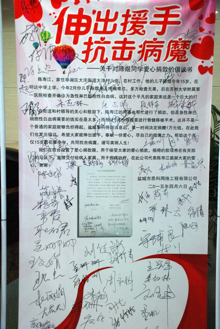 4月7日,在公司領(lǐng)導的關(guān)心和倡議下,鹽城思科全體員工發(fā)起了為陳煜同學愛心捐款的活動,大家都主動從自己的工資里拿出一百、五十、二十、十元……盡自己的微薄之力為陳煜同學獻上一份愛心,助其抗擊病魔,走出困境。